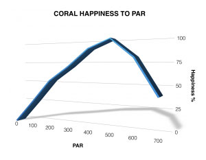 At certain parts of the specturm, the human eye cannot perceive light intensity changes once the light level exceeds a certain point. Too often this causes people to adjust their LED lights far past the ideal PAR level for their corals or plants. This usually results in burning, bleaching and/or death. With the PMK you can adjust your lights while monitoring exactly what light is affecting your corals and plants throughout the day. Also, not all corals are alike. Each type of coral has its own range of light intensity that makes it happy or not. The chart on the left shows this phenomenon without getting all technical.